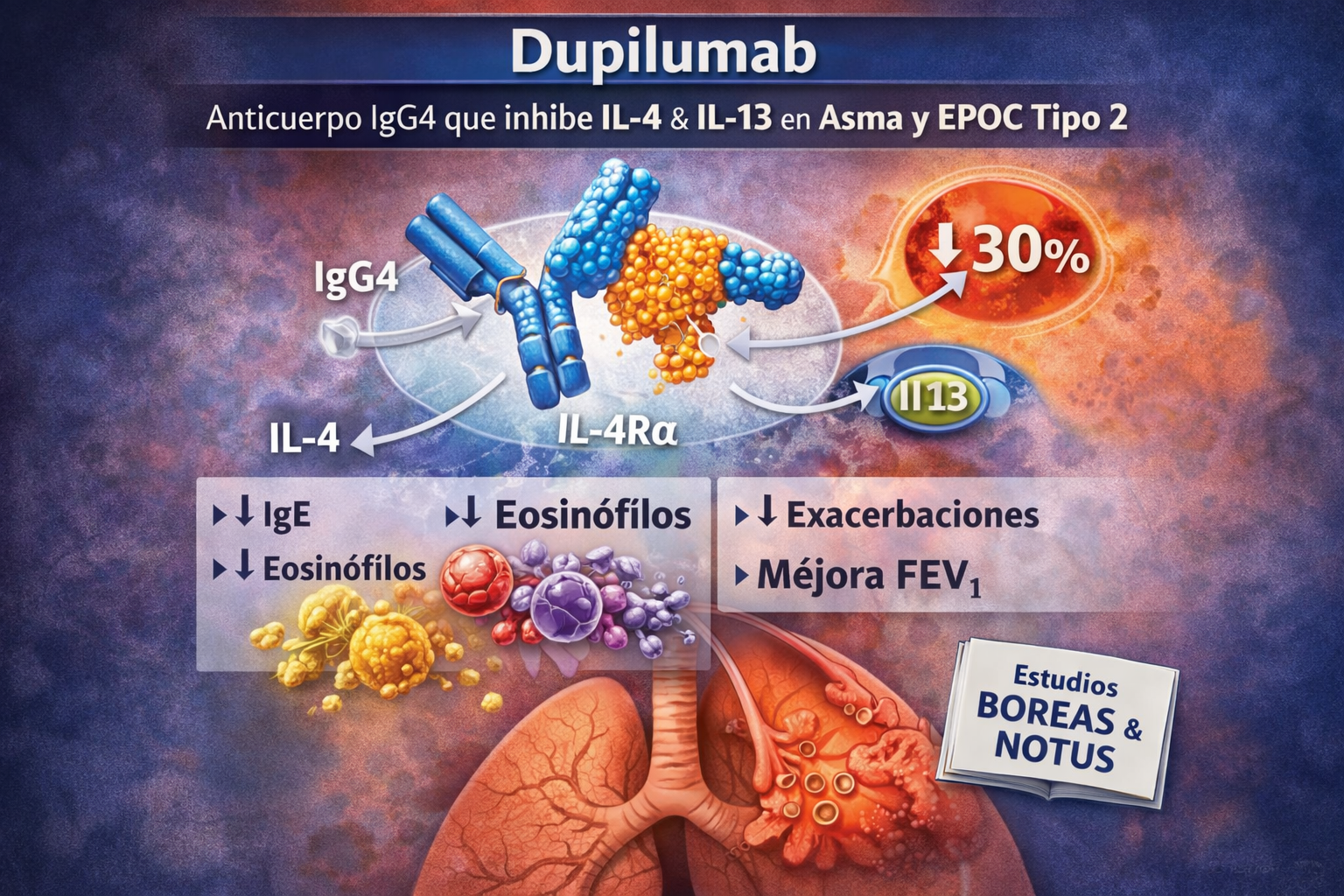 Dupilumab es un anticuerpo monoclonal humano IgG4 que se une a la subunidad alfa del receptor de interleucina 4 (IL‑4Rα), interrumpiendo la señalización tanto de IL‑4 como de IL‑13 y con ello la cascada inflamatoria de tipo 2 asociada a asma y EPOC. Esta doble inhibición reduce la producción de IgE, la quimiotaxis eosinofílica y la remodelación bronquial; de hecho, en los ensayos clínicos fase III BOREAS y NOTUS en EPOC con inflamación tipo 2, dupilumab logró reducir las exacerbaciones moderadas y graves alrededor de un 30 % y mejorar el FEV1 y la calidad de vida respecto a placebo.